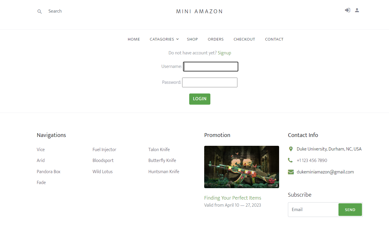 The user is able to login to the Mini Amazon store or sign up for a new account. Django authentication is used to ensure security and robustness of the web application.